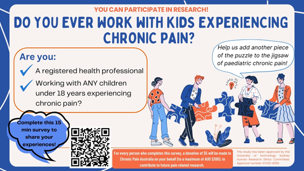 Are you a health professional who treats kids with chronic pain? Researchers at The University of Technology Sydney (UTS) would like to understand more about your clinical experiences in a 15-minute survey Participate here: https://t.co/071uD1wMw0